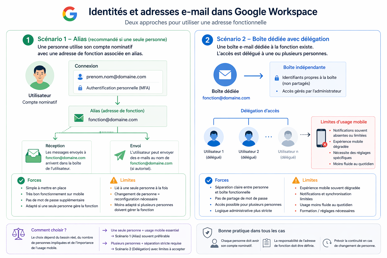 Le bon choix dépend du besoin réel. Si une seule personne utilise l’adresse et qu’un usage mobile fluide est indispensable, l’alias répond souvent mieux à la réalité de terrain. Si l’entreprise veut une séparation plus stricte, il faut accepter les limites d’usage connues de Google Workspace sur mobile.